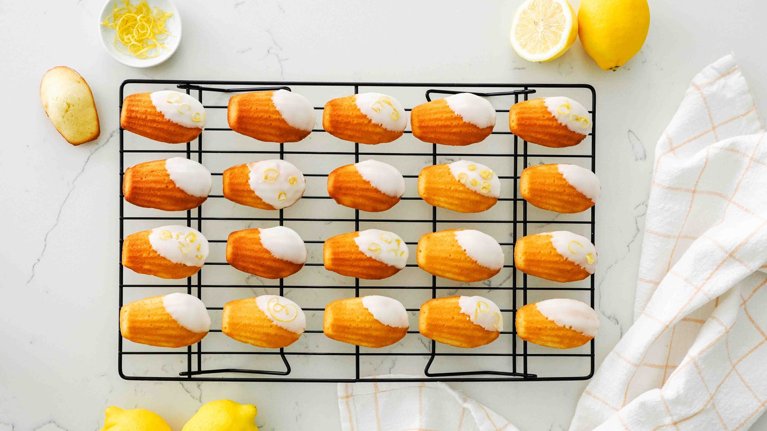 For this specific look, I dipped the lemon madeleines into the glaze at an angle, let some of the icing drip off, and then wiped off any excess along the edge of the bowl. While the glaze was still wet, I sprinkled a few lemon zest curls on top—that way they’d stick to the glaze!
